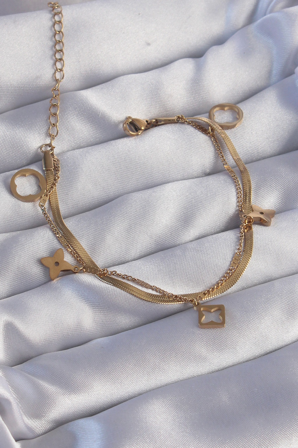 316L Çelik Gold Renk Çift Zincir Yonca Tasarım Bileklik - Lisinya