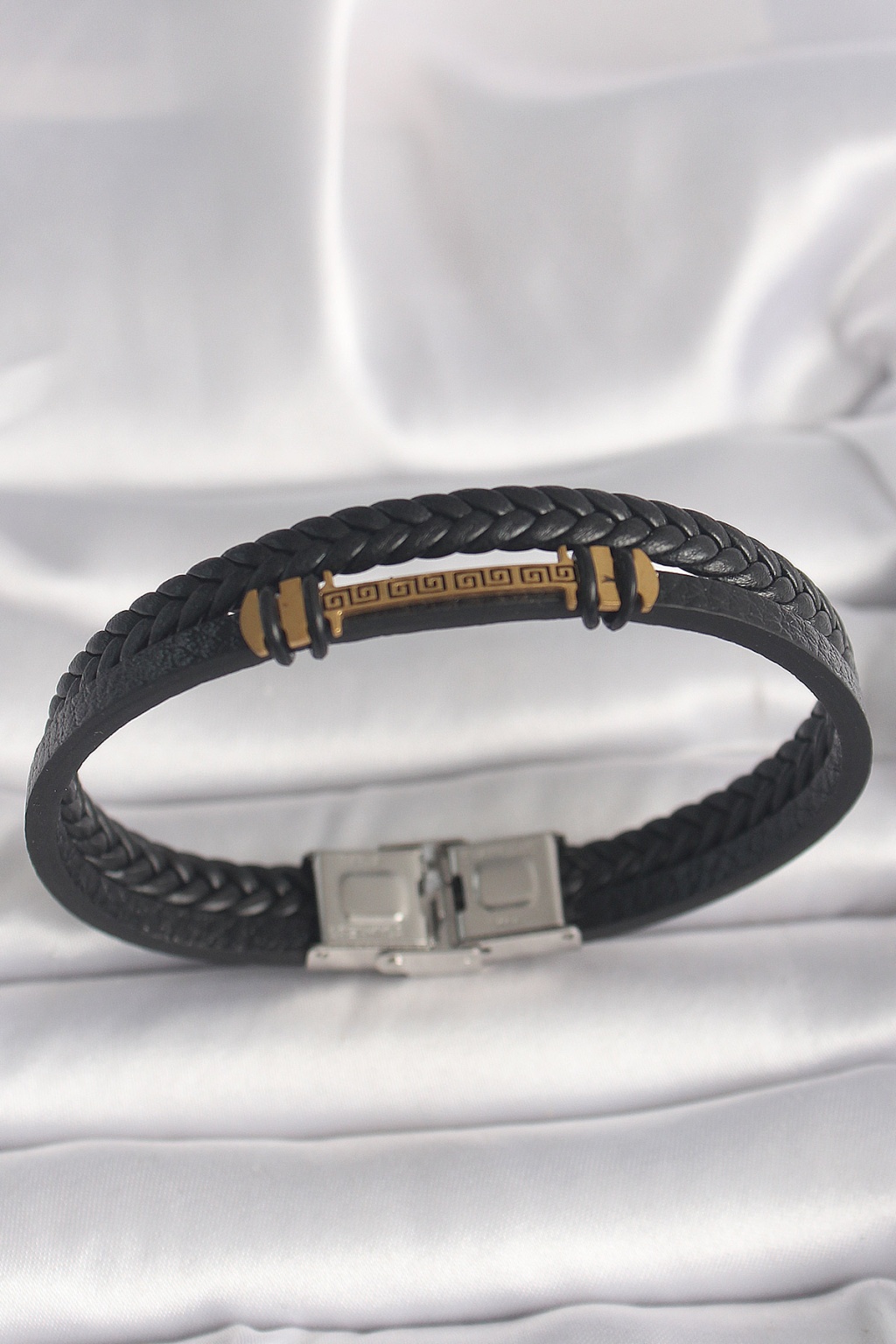 316L Çelik Gold Renk ZikZak İşlemeli Aksesuarlı Çift Sıra Burgu Desenli Deri Kordon Erkek Bileklik - Lisinya