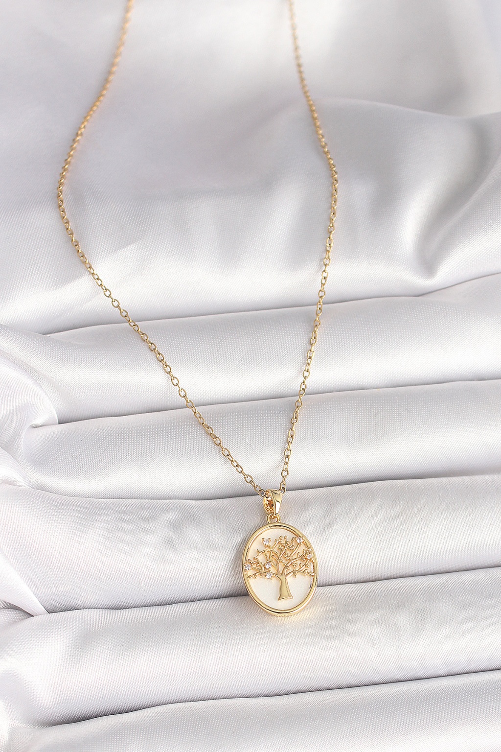 316L Çelik Gold Renk Zincir Zirkon Taş Detaylı Beyaz Mineli Ağaç İşlemeli Portre Model Kadın Kolye - Lisinya