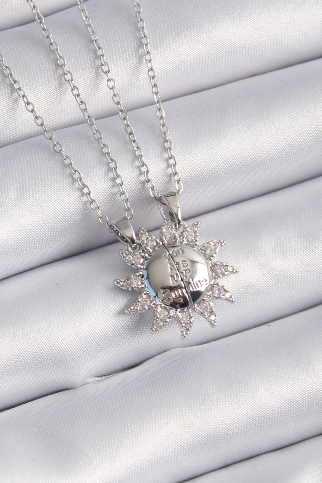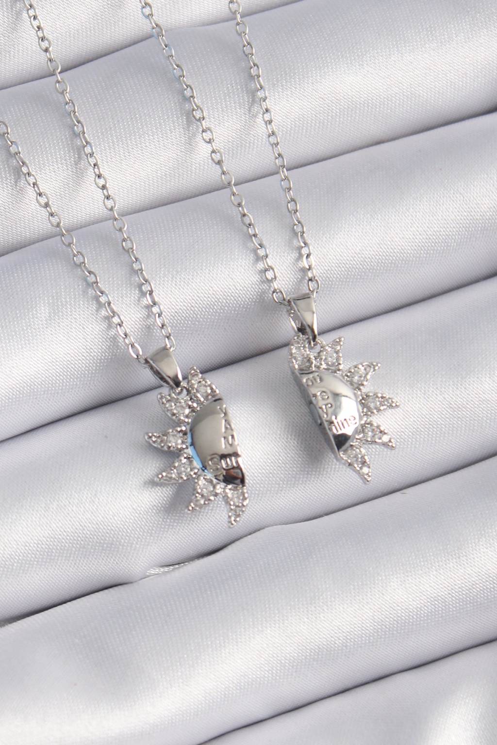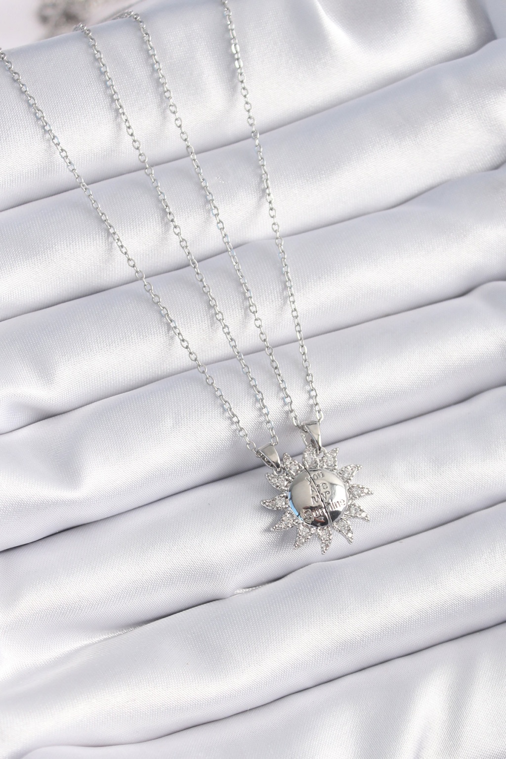 316L Çelik Gümüş Renk Zirkon Taşlı Güneş Model İşleme Yazı Detay Arkadaşlık Kolyesi - Lisinya