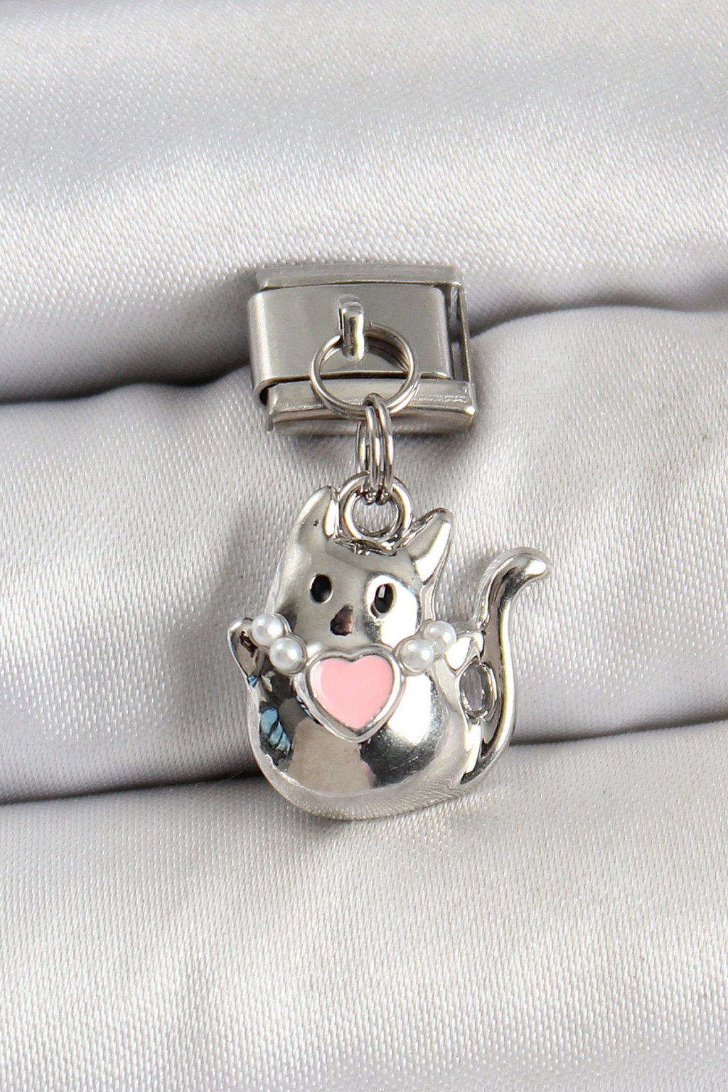 316L Çelik Sallantılı Kalp Detaylı Kedi Model Gümüş Renk Nomination Charm - Lisinya