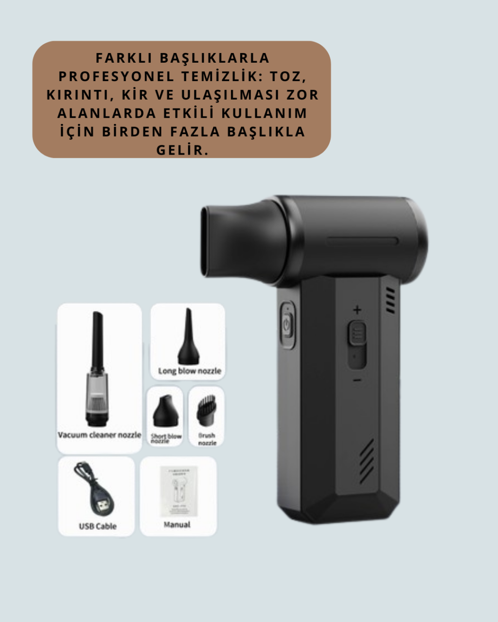 Araç içi detaylı temizlik için ideal olan bu hava üfleyici, güçlü motoruyla tozu ve kırıntıları tek hamlede uzaklaştırır. Klimalı ortamlarda veya yaz aylarında soğutma amacıyla da kullanılabilir. Şarjlı yapısı sayesinde priz arama derdi olmadan her yerde kullanabilirsiniz. Üç kademeli hız ayarı ile düşük, orta ve yüksek seviyelerde çalıştırılabilir. Kompakt tasarımı ile kolayca taşınır, ergonomik yapısı sayesinde uzun süreli kullanımda bile rahatlık sağlar. Farklı başlıklarla donatılmıştır, bu sayede klavye, fan, filtre, elektronik cihazlar ve dar alanlarda maksimum verim alınır. Dayanıklı gövdesi ile uzun yıllar güvenle kullanılabilir.Ürün Markası: Lisinya
