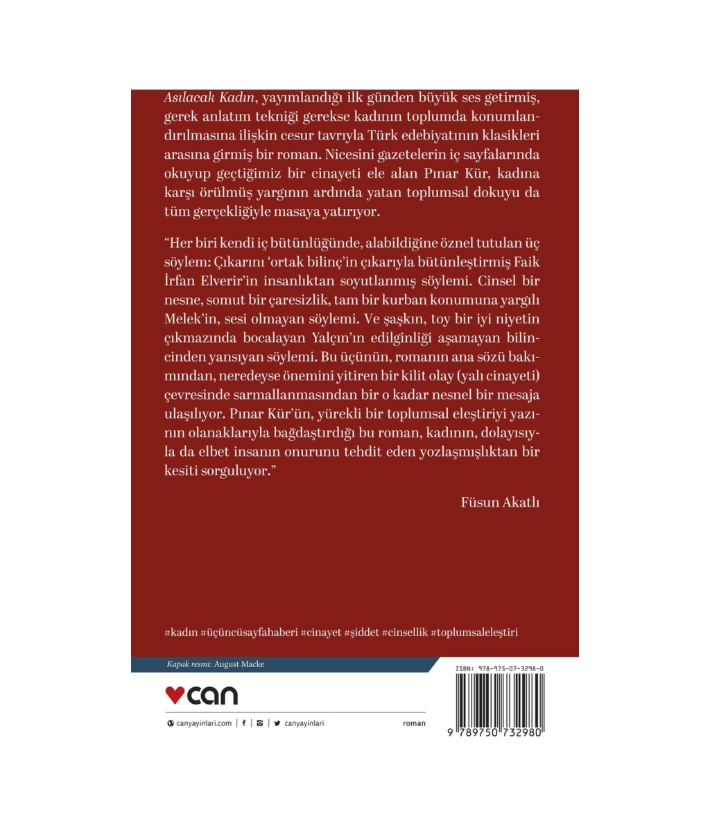 Asılacak Kadın, yayımlandığı ilk günden büyük ses getirmiş, gerek anlatım tekniği gerekse kadının toplumda konumlandırılmasına ilişkin cesur tavrıyla Türkçe edebiyatın klasikleri arasına girmiş bir roman. Nicesini gazetelerin iç sayfalarında okuyup geçtiğimiz bir cinayeti ele alan Pınar Kür, kadına karşı örülmüş yargının ardında yatan toplumsal dokuyu da tüm gerçekliğiyle masaya yatırıyor.