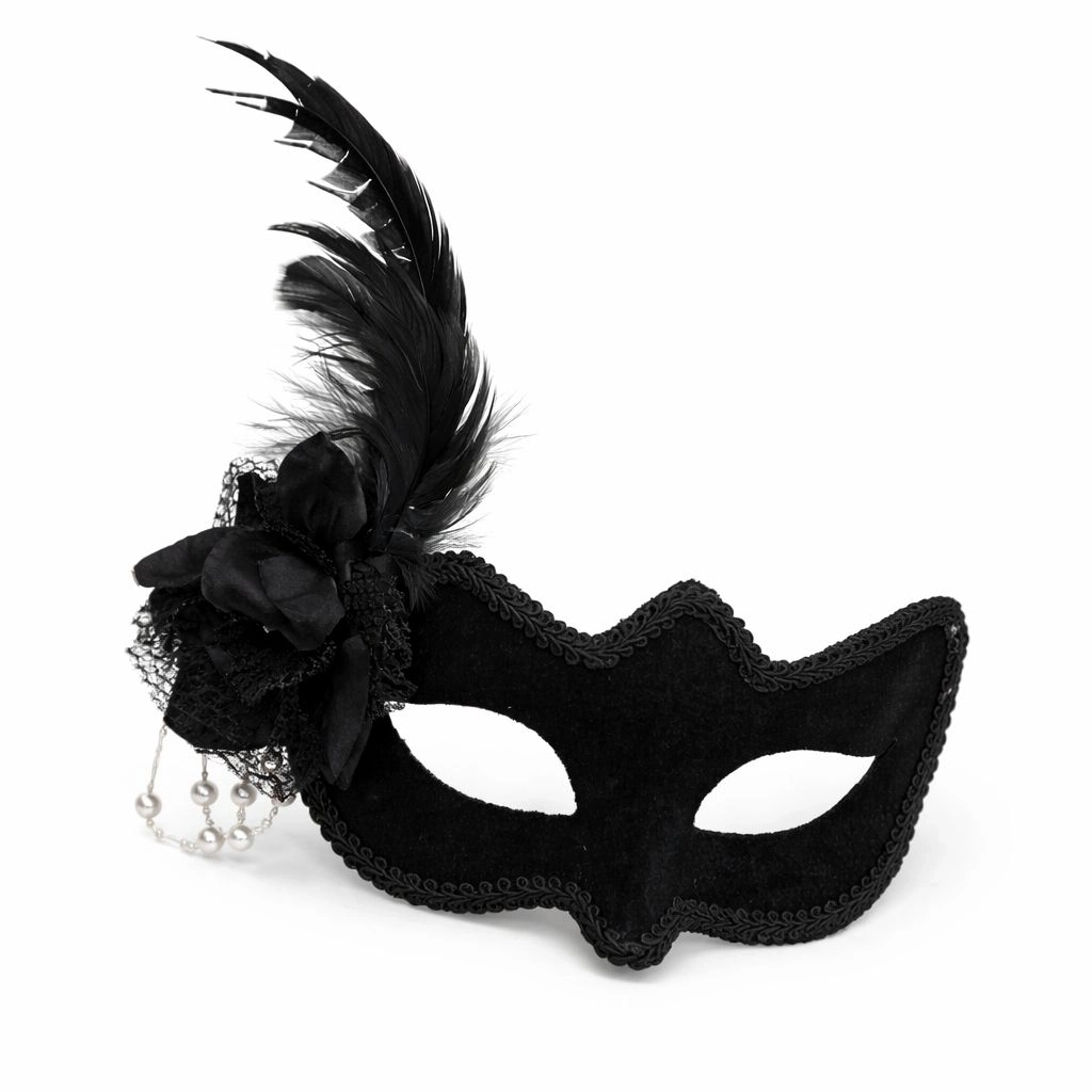 Beyaz İnci Detaylı Siyah Süet Venedik Kadın Maskesi Tüylü Güllü - Lisinya