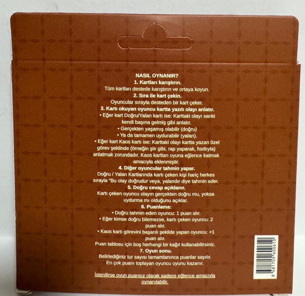 NASIL OYNANIR?1. Kartları karıştırın.Tüm kartları destede karıştırın ve ortaya koyun.2. Sıra ile kart çekin.Oyuncular sırayla desteden bir kart çeker.3. Kartı okuyan oyuncu kartta yazılı olayı anlatır.• Eğer kart Doğru/Yalan kartı ise: Karttaki olayı sanki kendi başına gelmiş gibi anlatır.•Gerçekten yaşamış olabilir (doğru)•Ya da tamamen uydurabilir (yalan).•Eğer kart Kaos kartı ise: Karttaki olayı kartta yazan özel görev şeklinde (örneğin şiir gibi, rap yaparak, fısıltıyla) anlatmak zorundadır. Kaos kartları oyuna eğlence katmak amacıyla eklenmıştır.4. Diğer oyuncular tahmin yapar.Doğru / Yalan Kartlarında kartı çeken kişi hariç herkes sırayla "Bu olay doğrudur veya, yalandır diye tahmin eder.5. Doğru cevap açıklanır.Kartı çeken oyuncu olayın gerçekten doğru mu, yoksa uydurma mı olduğunu açıklar.6. Puanlama:•Doğru tahmin eden oyuncu: 1 puan alır.•Eğer kimse doğru bilemezse, kartı çeken oyuncu: 2 puan alir.• Kaos kartı görevini başarılı şekilde yapan oyuncu: +1puan alır.Puan tablosu için boş herhangi bir kağıt kullanabilırsiniz.7. Oyun sonu.Belirlediğiniz tur sayısı tamamlanınca puanlar sayılır.En çok puanı toplayan oyuncu oyunu kazanır.Istenilirse ovun puansız olarak sadece eğlence amacıvia oynanılabilir.