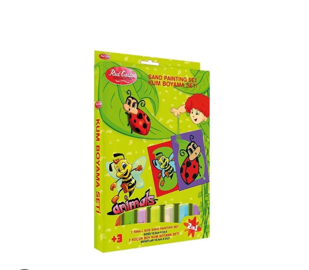 Eğitici ve Eğlenceli Kum Boyama Seti, Red Castle Uğur Böceği 2'si 1 arada DS-201Eğitici Kum Boyama Aktivite Seti ile çocuklarınızla birlikte eğlenceli vakit geçirin.Kutu içeriğinde bulunan 2 adet şeffaf jelatin ile yapmış olduğunuz kartları muhafaza edebilirsiniz.El ve göz koordinasyonunu sağlayarak ince motor becerilerinin gelişmesine yardımcı olur.EN-71,1,2,3 testleri mevcuttur. 3 yaş ve üstü için uygundur.Ürün İçeriği2 adet Kum Boyama Kartı (16.5x23.5 cm),2 adet boyanmış kartlar için jelatin,1 adet plastik cımbız,15 adet renkli tüp kum.