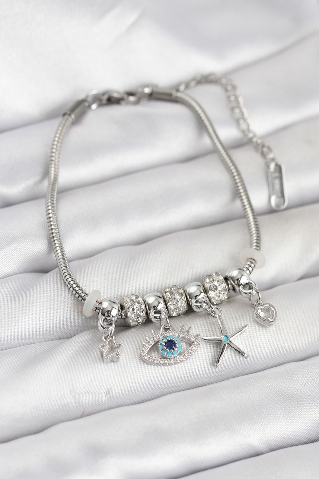 Pirinç Gümüş Renk Göz Model Charmlı Kadın Bileklik - Lisinya