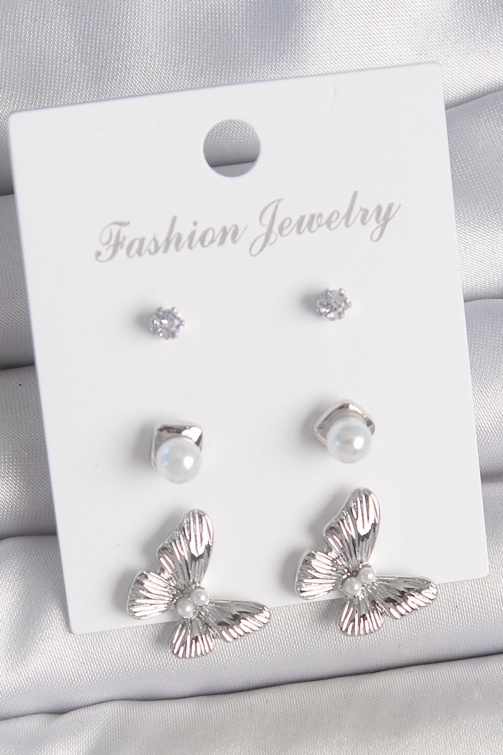 Pirinç Gümüş Renk Zirkon Taşlı İnci Detaylı Kelebek Model 3 Çift Kadın Küpe Seti - Lisinya