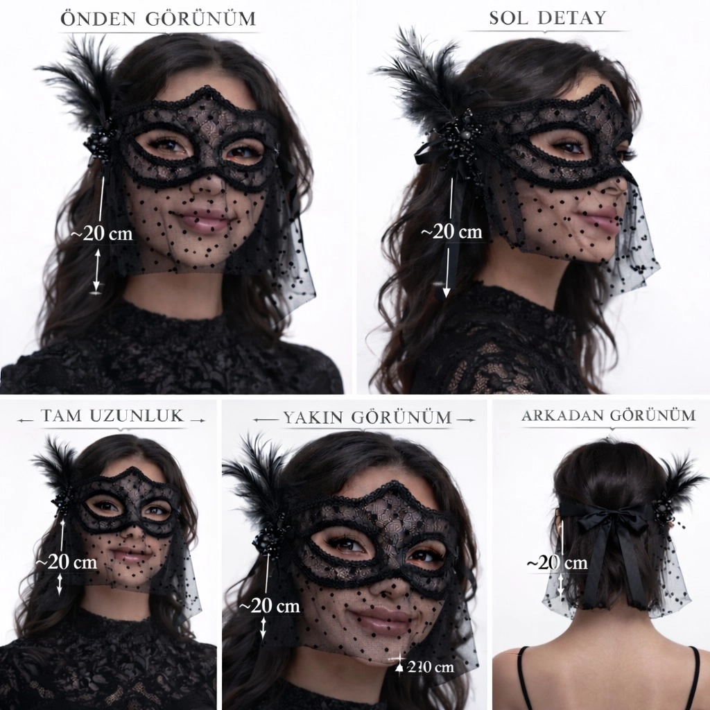 Gizemli ve şık bir görünüm isteyenler için tasarlanmış Siyah Dantel Tüllü Peçeli Parti Maskesi, zarif detaylarıyla dikkat çeker.bull Şeffaf dantel yüzey tasarımbull Puantiyeli ince tül peçe (yaklaşık 20 cm)bull Tüylü ve inci detaylı yan aksesuarbull İnce siyah bağlama kurdelesibull Hafif ve rahat kullanımMaskeli balo, konsept parti, doğum günü organizasyonları, özel davetler ve kostüm kombinleri için mükemmel bir tamamlayıcıdır.Hem gizemli hem zarif bir stil sunar.
