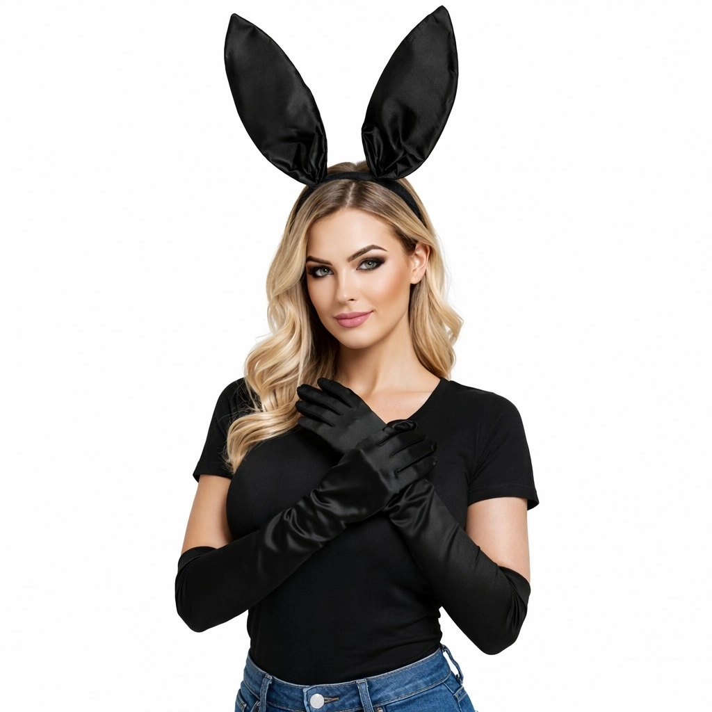 Siyah Parlak Tavşan Kulak Ve 40 Cm Parlak Siyah Eldiven Kostüm Seti - Lisinya