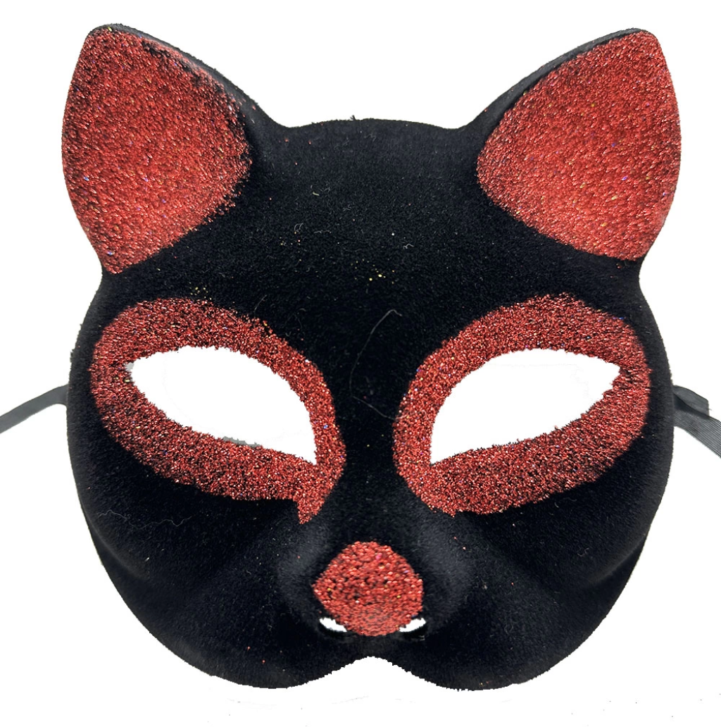 Siyah Renk Kırmızı Simli Süet Kaplama Kedi Maskesi 18x14 Cm - Lisinya