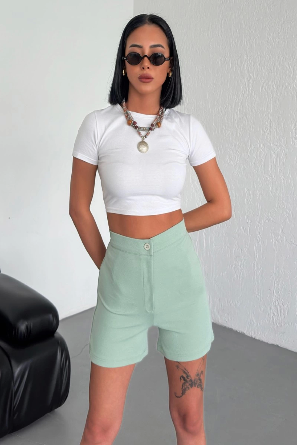 -Bu su yeşili krep şort, plaj günlerinden sokak stilinize kadar her ortamda mükemmel uyum sağlayacak şekilde tasarlandı. Esneklik ve nefes alabilirlik sunan dokusu, sıcak havalarda serin kalmanızı sağlarken, yüksek bel tasarımı da mükemmel bir uyum ve şıklık katıyor.