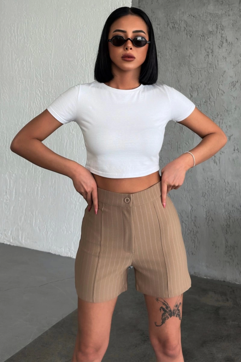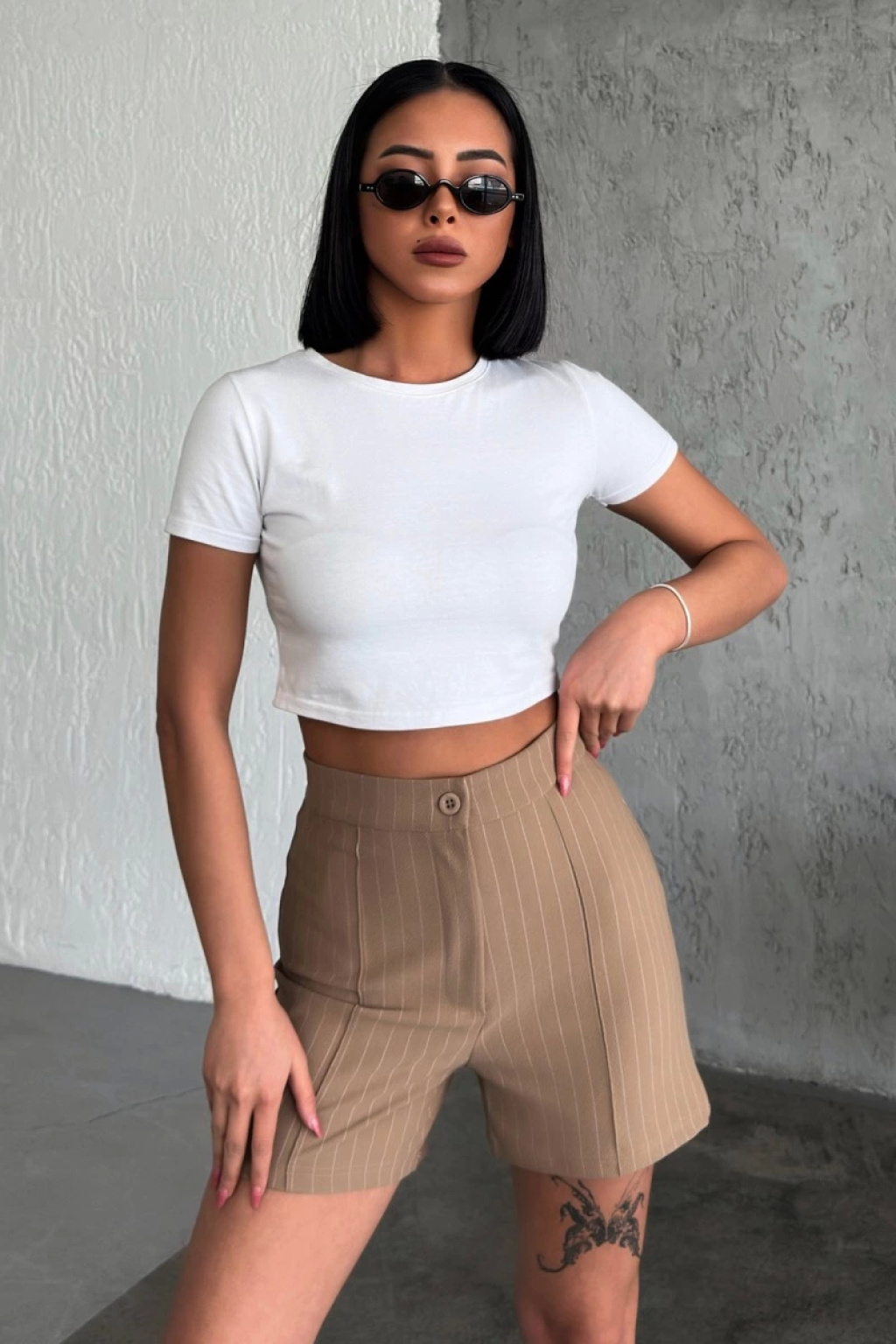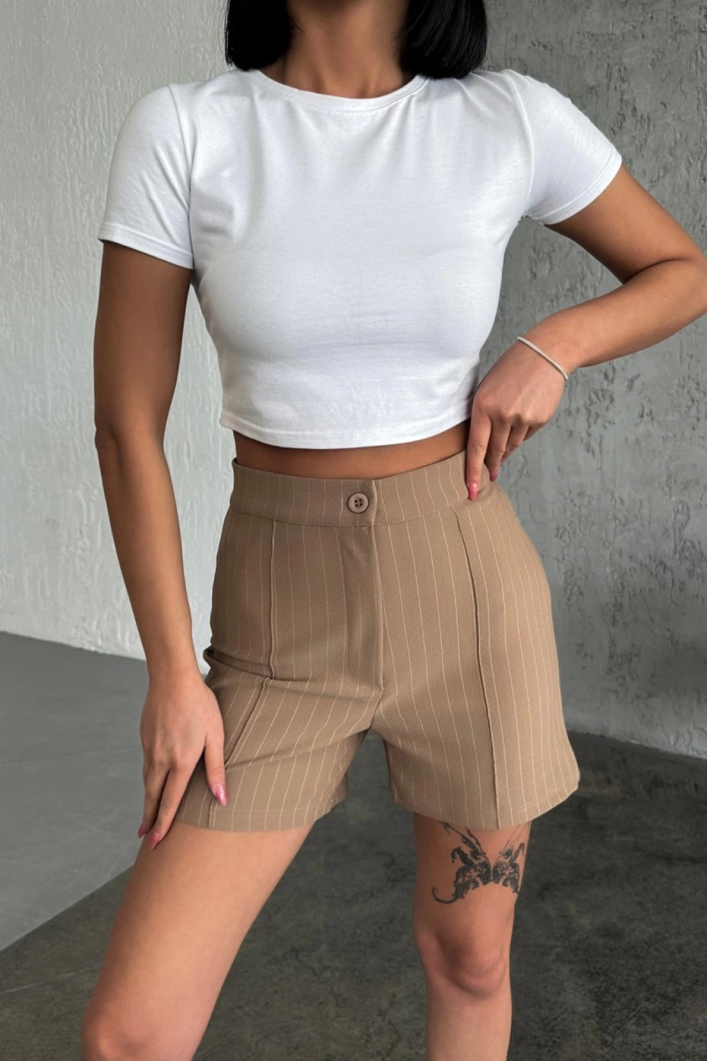 -Yüksek bel tasarımıyla vücudu saran ve zarif bir görünüm sunan, krep çımalı çizgili şort bej rengiyle gardırobunuzu güncelleyin. Bu şort, esnek likralı kumaşıyla hareket özgürlüğü ve konfor sunarken, şık çımalı çizgileriyle de tarzınızı tamamlayacak.